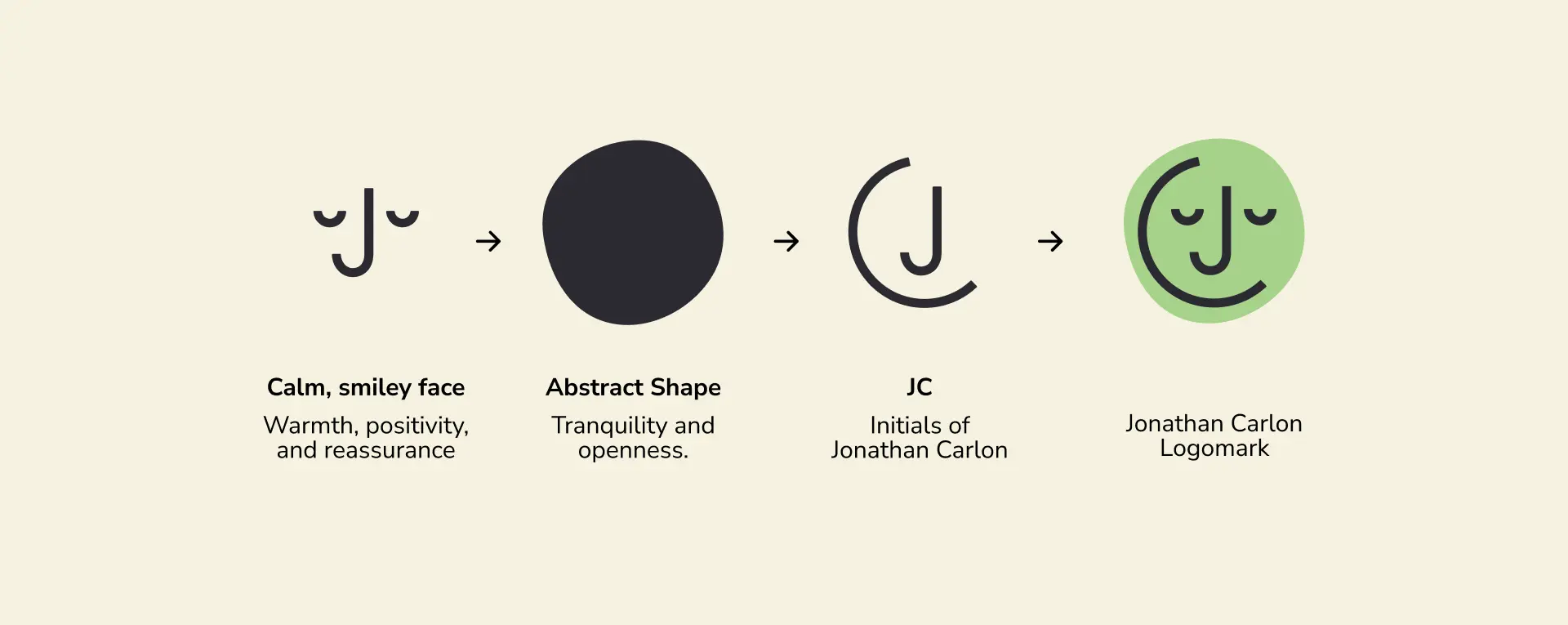 I designed a simple, friendly logomark featuring a calm, smiling face that subtly hides Jonathan’s initials, J and C. Behind it, a soft, abstract shape adds a sense of openness and tranquility, reinforcing the welcoming tone of the brand. The colour palette combines a gentle sand beige, a fresh leafy green, and a bright sunshine yellow to create a look that feels positive, grounded, and full of light.The result is a fresh, approachable identity that reflects Jonathan’s warm, confident approach and helps clients feel comfortable and at ease from the very first interaction